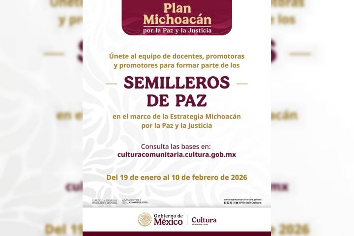 NOTICIAS 26/01/2026 ¿Eres docente o promotor cultural? Súmate a los Semilleros de Paz en Michoacán En el marco del Plan Michoacán por la Paz y la Justicia, la Secretaría de Cultura de Michoacán (Secum), en coordinación con su homóloga federal, convocan a docentes artísticos, promotoras y promotores culturales a participar en la conformación de hasta 20 Semilleros de Paz que operarán en diversos municipios del estado.