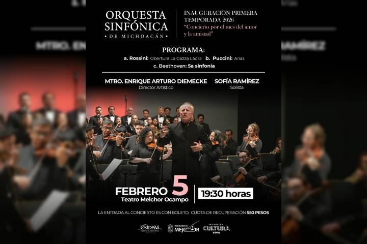 NOTICIAS 29/01/2026Osidem arranca su temporada 2026 con un concierto dedicado al amor La Secretaría de Cultura de Michoacán (Secum) anuncia la temporada 2026 de la Orquesta Sinfónica de Michoacán (Osidem) con el "Concierto por el mes del amor y la amistad", el jueves 5 de febrero a las 19:30 horas, en el Teatro Melchor Ocampo, bajo la dirección de Enrique Arturo Diemecke y con la participación de la soprano Sofía Ramírez.
