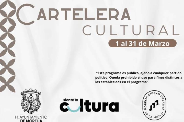 NOTICIAS 05/03/2024En cartelera cultural de Morelia, clases y talleres para todas las edades Porque la cultura ofrece oportunidades de aprendizaje, creatividad y recreación, el Ayuntamiento de Morelia informa que las y los morelianos ya pueden consultar la cartelera de actividades culturales que se llevarán a cabo durante el mes de marzo para toda la familia, entre las cuales están conciertos, talleres, masterclass y presentación de libro.