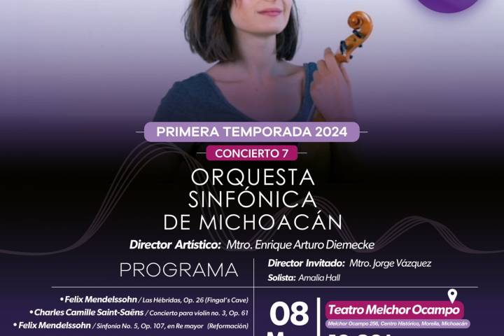 Reconocida por su perspicacia y virtuosismo deslumbrante, la violinista neozelandesa Amalia Hall unirá su talento junto a la Orquesta Sinfónica de Michoacán (Osidem), durante el séptimo concierto de la primera temporada 2024, que se llevará a cabo el 8 de marzo del presente año.