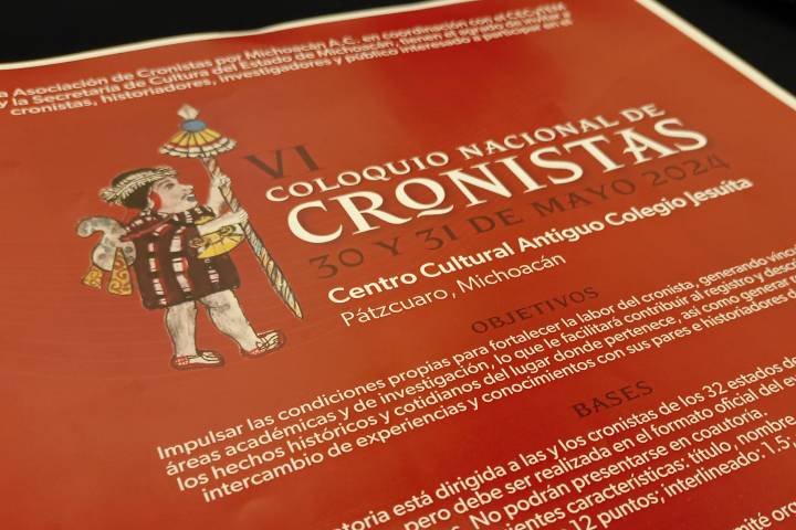 NOTICIAS 02/02/2024 Anuncian convocatoria del Coloquio Nacional de Cronistas 2024Cronistas, historiadores, investigadoras y público en general en todo México, podrán participar en el VI Coloquio Nacional de Cronistas, que se realizará en mayo en el Centro Cultural Antiguo Colegio Jesuita, en Pátzcuaro. La recepción de ponencias será hasta el 30 de abril del presente año.