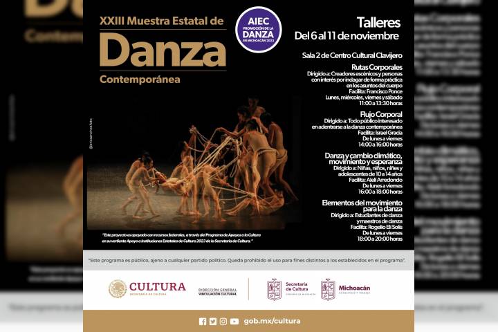 NOTICIAS 03/11/2023Oferta Secum 4 talleres gratuitos de la Muestra de Danza ContemporáneaCon el objetivo de promover el quehacer dancístico contemporáneo y fomentar la reflexión desde los principios de la interculturalidad, la Secretaría de Cultura de Michoacán (Secum) invita a cuatro talleres de la XXIII Muestra Estatal de Danza Contemporánea, del 6 al 11 de noviembre, en el Centro Cultural Clavijero.