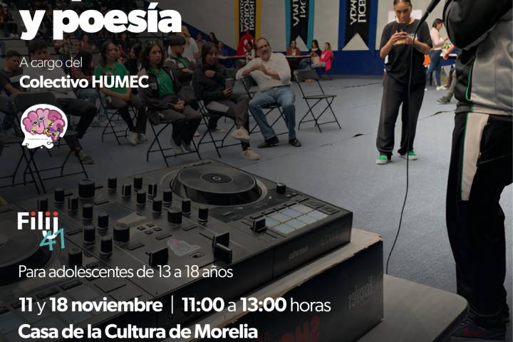 NOTICIAS 04/11/2023¿Te late el rap? Asiste al taller en la Casa de la Cultura de MoreliaLa Secretaría de Cultura de Michoacán en coordinación con la Feria Internacional del Libro Infantil y Juvenil, abre la invitación para que las adolescencias participen en el Taller Rap, ritmo y poesía, que tendrá lugar el 11 y 18 de noviembre, de 11:00 a 13:00 horas, en la Casa de la Cultura de Morelia a cargo del Colectivo Humec.