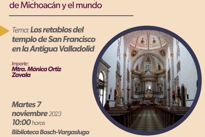 NOTICIAS 05/11/2023Conoce más del templo de San Francisco en esta conferencia con la SecumAmantes del patrimonio tangible e intangible tendrán la oportunidad de profundizar en el tema de los retablos del templo de San Francisco en la Antigua Valladolid, durante la conferencia virtual que la Secretaría de Cultura de Michoacán (Secum) ofrecerá a través de Google Meet, el 7 de noviembre a las 10:00 horas, en el marco del ciclo Entre paralelismos: el patrimonio de Michoacán y el mundo.