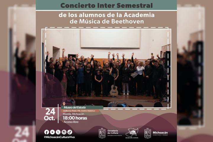 NOTICIAS 23/10/2023Invita Secum al concierto de la Academia Música BeethovenCon obras que van desde Bach, Haydn, Beethoven, Carulli y Bellini, hasta llegar al folclor, la Academia de Música Beethoven, a cargo de sus alumnas y alumnos, en el Museo del Estado de la Secretaría de Cultura de Michoacán (Secum), el próximo 24 de octubre.