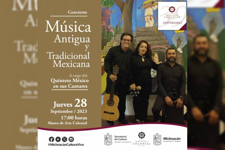 NOTICIAS 27/09/2023Museo de Arte Colonial celebrará 39 años con concierto de música mexicanaEste jueves 28 de septiembre la SecretarÃa de Cultura de Michoacán (Secum) celebrará el 39 aniversario del Museo de Arte Colonial con un concierto gratuito de música tradicional mexicana a cargo del quinteto México en sus Cantares, a las 17:00 horas.