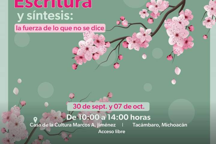NOTICIAS 29/09/2023Ofertará Secum taller de escritura y sÃntesis, en TacámbaroAnalizar textos de difÃcil clasificación y explorar distintos géneros literarios, son algunas de las actividades que se realizarán en el taller "Escritura y sÃntesis: la fuerza de lo que no se dice", que la SecretarÃa de Cultura de Michoacán (Secum) ofertará del 30 de septiembre al 7 de octubre, de 10:00 a 14:00 horas, en la Casa de la Cultura Marcos A. Jiménez, de Tacámbaro.