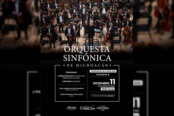 NOTICIAS 08/12/2025Osidem presenta repertorio de Schumann y Bruckner en su sexto concierto de temporada: SecumLa SecretarÃa de Cultura de Michoacán (Secum) invita al sexto concierto de temporada de la Orquesta Sinfónica de Michoacán (Osidem), que se realizará este jueves 11 de diciembre a las 19:30 horas en el Teatro Melchor Ocampo. El programa contempla el Concierto para violonchelo en La menor de Robert Schumann y la Cuarta SinfonÃa de Anton Bruckner.
