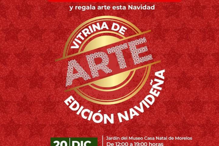 NOTICIAS 08/12/2025 Ya viene la Vitrina de Arte edición navideña, en la Casa Natal de Morelos: SecumLa SecretarÃa de Cultura de Michoacán invita a disfrutar y apoyar el talento local en la Vitrina de Arte edición navideña, que se realizará el próximo 20 de diciembre, de 12:00 a 19:00 horas, en el jardÃn del Museo Casa Natal de Morelos con entrada libre.