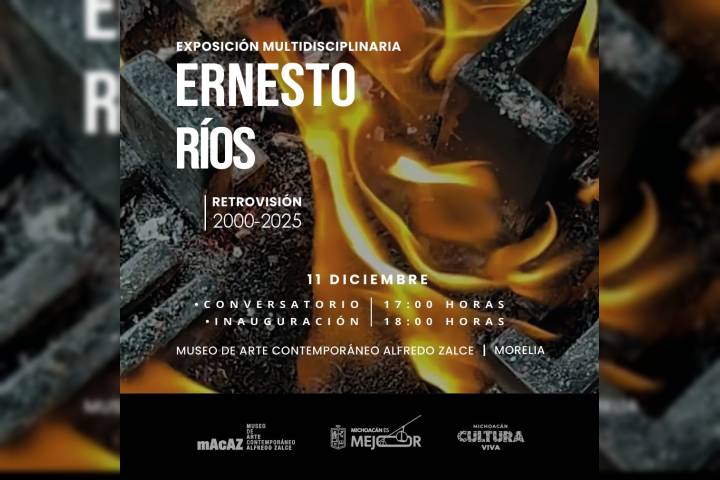 NOTICIAS 10/12/2025 Exposición multidisciplinaria de Ernesto RÃos llega al Macaz: Secum La SecretarÃa de Cultura de Michoacán (Secum) inaugurará la exposición multidisciplinaria "Ernesto RÃos. Retrovisión 2000-2025", el 11 de diciembre a las 18:00 horas en el Museo de Arte Contemporáneo "Alfredo Zalce" (Macaz). El recorrido visual reúne 25 años de investigación artÃstica en torno a la ciencia, memoria y estructuras que organizan la vida cotidiana.