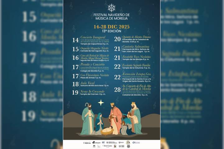 NOTICIAS 11/12/2025Anuncian XIII Festival Navideño de Música de MoreliaDel 14 al 28 de diciembre se realizará la XIII edición del Festival Navideño de Música Morelia, en varios recintos de esta capital, asà lo anunció su organizador, Faustino Aguilar MartÃnez.