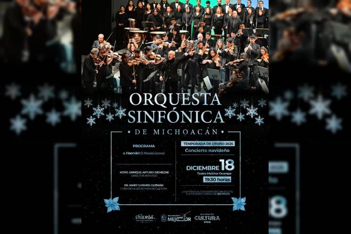 NOTICIAS 16/12/2025No te pierdas el concierto navideño de la Osidem este jueves en el Teatro Ocampo La SecretarÃa de Cultura de Michoacán (Secum) invita al público al concierto navideño de cierre de la Temporada de Otoño 2025 de la Orquesta Sinfónica de Michoacán (Osidem), con la interpretación integral de "El MesÃas", de Georg Friedrich Händel.