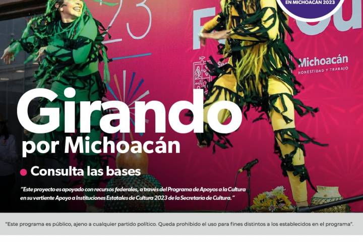 NOTICIAS 11/08/2023Abre Secum la convocatoria de danza Girando por Michoacán Con el objetivo de promover y difundir el talento cultural del gremio dancístico del estado, la Secretaría de Cultura de Michoacán (Secum) invita a participar en la convocatoria Girando por Michoacán, para integrar una programación a llevarse a cabo de octubre a noviembre de 2023, en la región Cuitzeo.