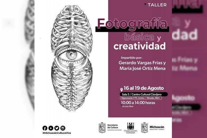 NOTICIAS 13/08/2023Ofrece Secum taller gratuito de fotografía, en MoreliaLa Secretaría de Cultura de Michoacán (Secum) invita a las personas mayores de 18 años con experiencia en dibujo, artes visuales, ilustración o diseño, a participar en el taller "Fotografía Básica y Creatividad" que se impartirá de manera gratuita del 16 al 19 de agosto en el Centro Cultural Clavijero, de 10:00 a 14:00 horas.