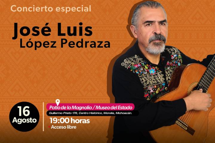 NOTICIAS 14/08/2023Dará José Luis López Pedraza concierto por los 37 años del Museo del EstadoEl cantautor michoacano José Luis López Pedraza brindará un concierto especial en el marco del 37 aniversario del Museo del Estado de la Secretaría de Cultura de Michoacán (Secum), a realizarse el próximo 16 de agosto a las 19:00 horas.