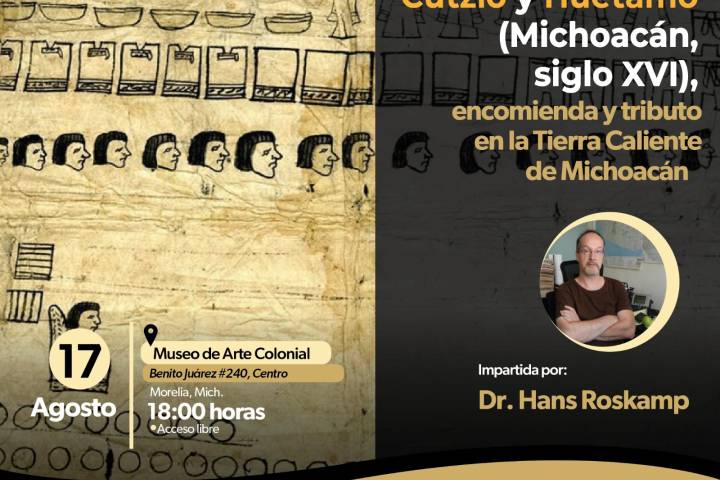 NOTICIAS 16/08/2023Invita Secum a la conferencia de los códices de Cutzio y Huetamo La Secretaría de Cultura de Michoacán (SECUM) invita a la conferencia "Los tres códices de Cutzio y Huetamo (Michoacán, siglo XVI)", a cargo del doctor Hans Roskamp, este jueves 17 de agosto a las 18:00 horas, en el Museo de Arte Colonial.