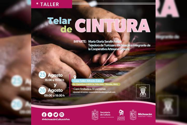NOTICIAS 16/08/2023Invita Secum al taller artesanal de telar de cintura A cargo de la artesana turicatense María Gloria Serafín Felipe, la Secretaría de Cultura de Michoacán (Secum) invita al taller de telar de cintura, los días 25 y 26 de agosto en la Casa Taller Alfredo Zalce.