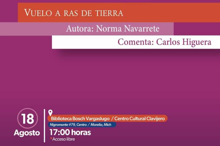 NOTICIAS 17/08/2023Presentará Secum libro de poesía Vuelo a ras de tierraLa Secretaría de Cultura de Michoacán (Secum), presentará este viernes el libro de poesía "Vuelo a ras de tierra" de la escritora moreliana Norma Navarrete.