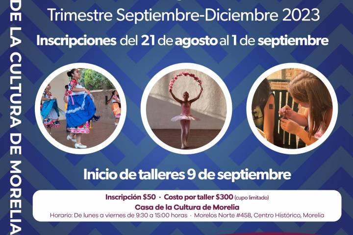 NOTICIAS 18/08/2023Próximo lunes inician inscripciones a talleres de la Casa de la Cultura de Morelia Del lunes 21 de agosto al viernes 1 de septiembre, se llevarán a cabo las inscripciones al trimestre septiembre-diciembre de los talleres de la Casa de la Cultura de Morelia, que ofrece 142 opciones diferentes y cuyas clases iniciarán el 9 de septiembre.