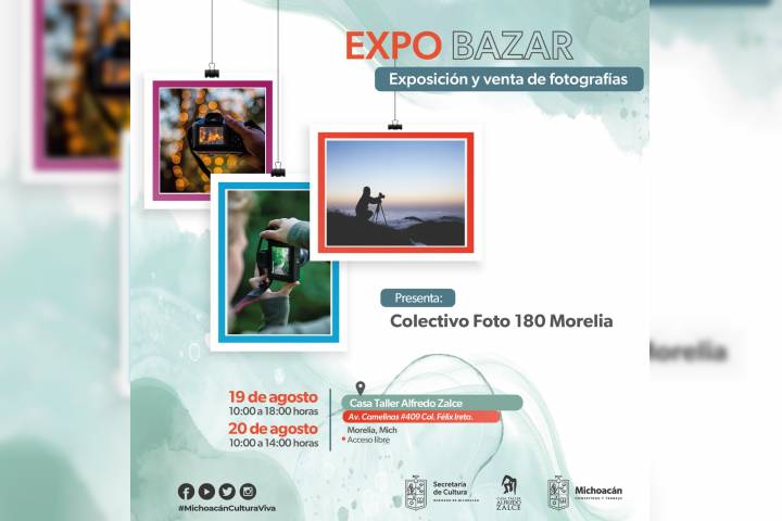 NOTICIAS 18/08/2023Con expo-bazar celebrará Secum el Día Mundial de la FotografíaCon motivo del Día Mundial de la Fotografía, la Secretaría de Cultura de Michoacán (Secum), en coordinación con el Colectivo Foto 180, invita a la expo bazar, donde se realizará la exposición y venta de fotografías, este 19 y 20 de agosto en Casa Taller Alfredo Zalce.