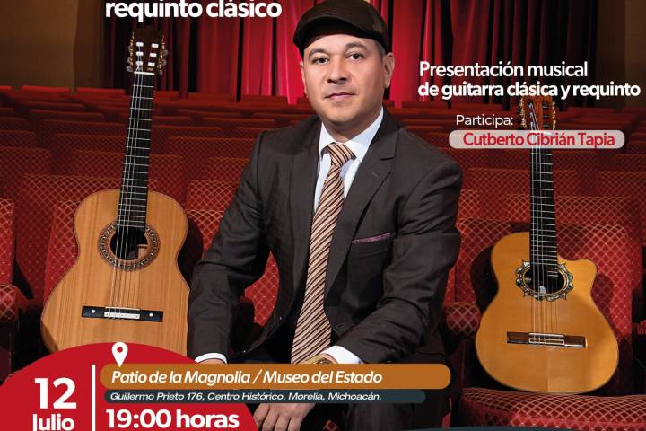 NOTICIAS 10/07/2023Invita Secum a una tarde de música y lectura, en el Museo del Estado La Secretaría de Cultura de Michoacán (Secum) invita este miércoles 12 de julio a una tarde musical en el Museo del Estado. Se presentará el libro Cinco estudios para requinto clásico, y se realizará un recital de guitarra clásica y requinto, ambos de la autoría de Cutberto Cibrián Tapia.