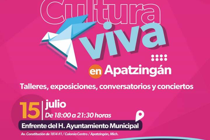 NOTICIAS 15/07/2023Este sábado, arranca Secum jornadas culturales en ApatzingánEl Gobierno de Michoacán, a través de la Secretaría de Cultura del Estado (Secum) invita a habitantes de la región de Tierra Caliente, a las actividades del programa Michoacán Cultura Viva, que darán inicio este fin de semana de Apatzingán, a las afueras del Ayuntamiento.