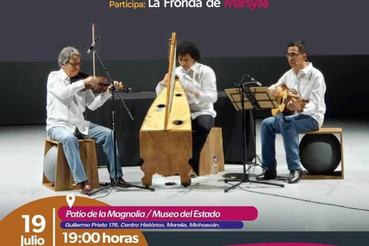 NOTICIAS 18/07/2023Gran concierto de sones llegará el miércoles al Museo del Estado La Fronda de Marsyas presentará "Valonas para las cinco cuerdas" el próximo 19 de julio a las 19:00 horas en el Museo del Estado, como parte del programa Arte, Historia y Tradición Popular de la Secretaría de Cultura de Michoacán (Secum).