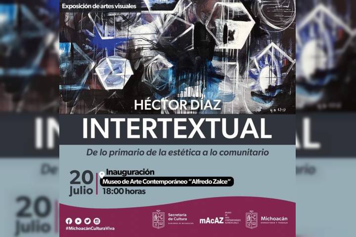 NOTICIAS 19/07/2023Presentará Secum obras de arte contemporáneo de Héctor Díaz Obras de arte contemporáneo multidisciplinario con distintas propuestas y técnicas como la pintura, el grabado, la fotografía, la instalación y el video, conforman la exposición "Intertextual. De lo primario de la estética a lo comunitario", del maestro Héctor Díaz Guerrero, que inaugurará la Secretaría de Cultura de Michoacán (Secum) el próximo 20 de julio a las 18:00 horas en el Museo de Arte Contemporáneo Alfredo Zalce (MACAZ).