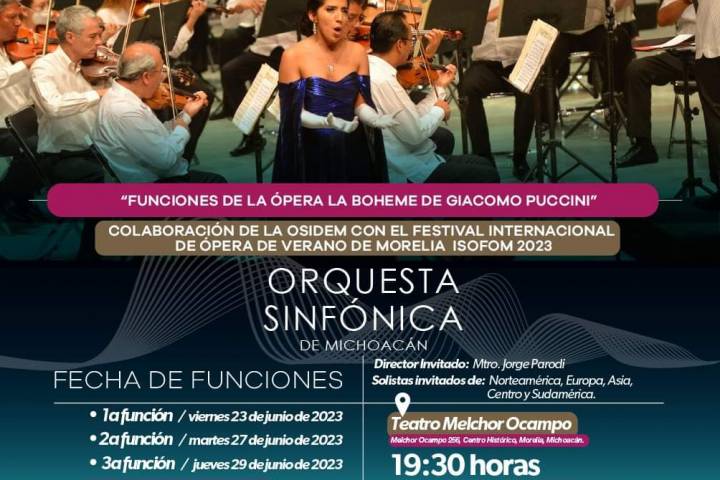 NOTICIAS 20/06/2023Anuncia Secum 3 conciertos de ópera con artistas internacionalesLa SecretarÃa de Cultura de Michoacán (Secum) invita al público a disfrutar de las presentaciones próximas tres funciones de ópera de la Orquesta Sinfónica de Michoacán (Osidem) en colaboración con el Internacional Summer Opera Festival of Morelia (Isofom)