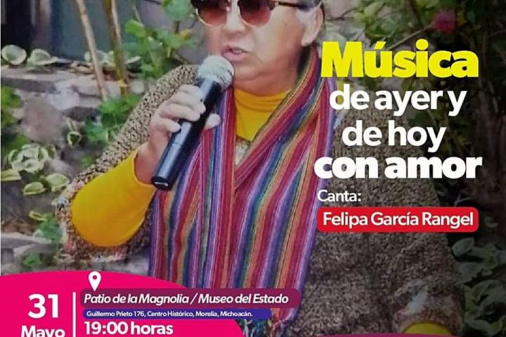 NOTICIAS 31/05/2023Este miércoles, concierto de música bohemia en el Museo del Estado Llegará al Patio de la Magnolia del Museo del Estado la artista Felipa García Rangel para ofrecer su concierto Música de ayer y hoy con amor, que tendrá lugar el 31 de mayo a las 19:00 horas, respaldado por la Secretaría de Cultura de Michoacán.