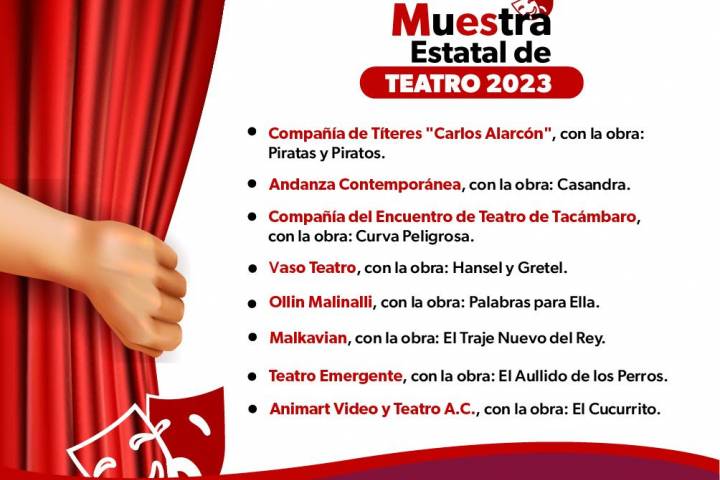 NOTICIAS 02/06/2023Anuncia Secum programación de la Muestra Estatal de Teatro 2023 Obras teatrales, talleres y lecturas dramatizadas con acceso libre a público, formarán parte de la programación de la Muestra Estatal de Teatro 2023 que se llevará a cabo del 6 al 11 de junio en Tacámbaro, Uruapan y Morelia, a cargo de las compañías ganadoras de esta convocatoria que encabeza la Secretaría de Cultura de Michoacán (Secum).