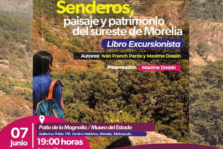 NOTICIAS 05/06/2023Anuncia Secum presentación de libro excursionista, en el Museo del EstadoLa Secretaría de Cultura de Michoacán (Secum) invita a la presentación del libro Senderos, paisaje y patrimonio obra del sureste de Morelia, a cargo Maxime Dossin, uno de los coordinares de esta obra que se presentará el próximo 7 de junio a las 19:00 horas en las instalaciones del Museo del Estado.