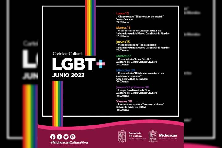 NOTICIAS 05/06/2023Secum da a conocer la cartelera cultural del orgullo 2023 La Secretaría de Cultura de Michoacán (Secum), se une a la visibilización y dignificación de la comunidad LGBTTTIQ+ con una programación de actividades artísticas y culturales de concientización a realizarse en Morelia, Paracho y Zamora.