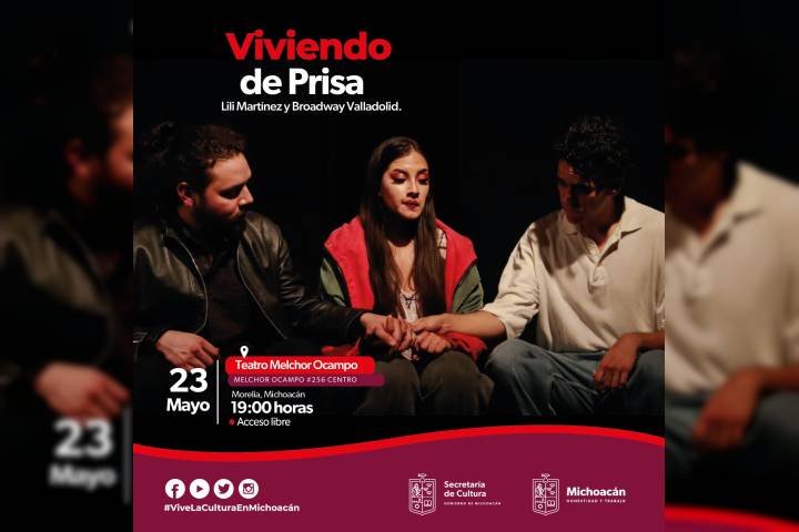NOTICIAS 23/05/2023Invita Secum al musical Viviendo de Prisa, una historia de poliamor y bisexualidad En el marco del Martes de Teatro, la Secretaría de Cultura de Michoacán (Secum) invita este 23 de mayo a la obra musical Viviendo de Prisa, a realizarse a las 19:00 horas en el Teatro Ocampo, con entrada gratuita.
