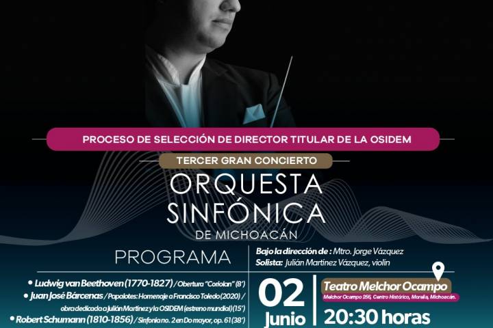 NOTICIAS 28/05/2023Anuncia Secum último concierto del concurso para director titular de la OSIDEM La Secretaría de Cultura de Michoacán (Secum) anunció el último gran concierto del proceso de selección para director titular de la Orquesta Sinfónica de Michoacán (OSIDEM), mismo que se realizará bajo la batuta del maestro Jorge Vázquez, el próximo viernes 2 de junio, en el Teatro Melchor Ocampo.