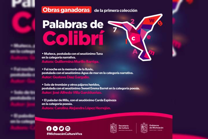 NOTICIAS 30/05/2023Anuncia Secum a ganadores de la convocatoria Palabras de ColibríLa Secretaría de Cultura de Michoacán (Secum) dio a conocer las cuatro obras seleccionadas que conformarán la primera colección Palabras de Colibrí; certamen que convocó a autoras y autores michoacanos en el estado, cuya producción literaria será difundida en el marco del Programa Nacional de Salas de Lectura.