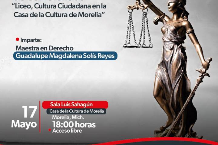 NOTICIAS 16/05/2023Invita Secum a ciclo de conferencias gratuitas en materia de derechoCon el fin de incluir nuevas formas de expresión comunitaria, la Secretaría de Cultura de Michoacán (Secum) invita al ciclo de conferencias organizado por el grupo Liceo Cultura Ciudadana, que se desarrollará de manera mensual, del 17 de mayo al 13 de diciembre, en la Casa de la Cultura de Morelia.