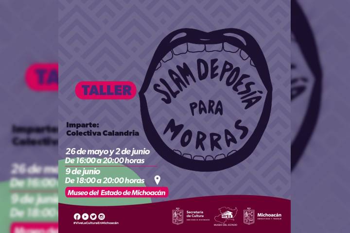 NOTICIAS 16/05/2023Invita Secum al taller Slam de poesía para morras, en el Museo del EstadoCon la finalidad de fomentar la poesía para mujeres y por mujeres, la Secretaría de Cultura de Michoacán (Secum) invita a inscribirse al taller de Slam de poesía para morras, a iniciarse el próximo 26 de mayo, en las instalaciones del Museo del Estado.
