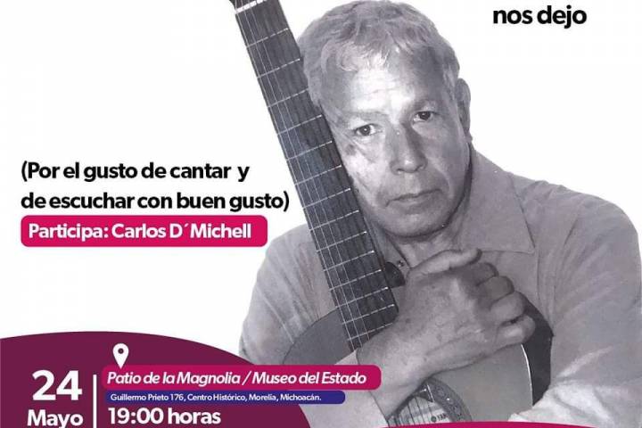 NOTICIAS 20/05/2023Secum anuncia tarde bohemia con el cantante Carlos DMichelleComo parte del programa Arte, Historia y Tradición Popular, la Secretaría de Cultura de Michoacán (Secum) ofrecerá el recital Lo que la música? nos dejó, de Carlos D´Michelle, a realizarse el próximo 24 de mayo en el Museo del Estado.