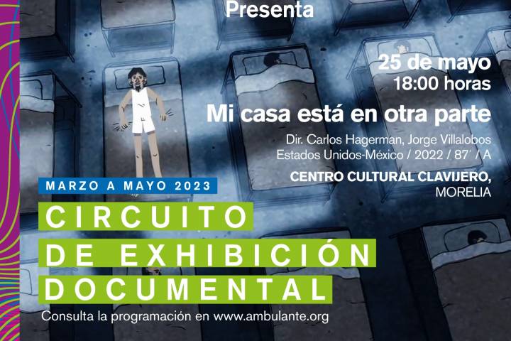 NOTICIAS 21/05/2023Próximo jueves, última función de Ambulante Presenta 2023La Secretaría de Cultura de Michoacán (Secum) invita a disfrutar de la última proyección del Circuito de Exhibición Documental de Ambulante Presenta 2023, con el largometraje Mi casa está en otra parte, a proyectarse el próximo jueves 25 de mayo a las 18:00 horas, en el Centro Cultural Clavijero.