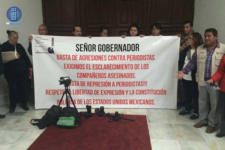 NOTICIAS 08/12/2016Se manifiestan periodistas; exigen protección para el gremioUn grupo de al menos 20 periodistas, se manifestaron este jueves en Palacio de Gobierno en exigencia del alto a la represión contra el gremio, luego de que un periodista fuera agredido en la manifestación que la CNTE realizó en el municipio de Pátzcuaro.