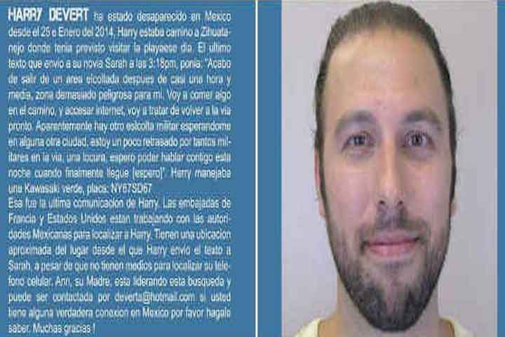 NOTICIAS 10/02/2014Buscan a francoestadunidense presuntamente perdido en Michoacán Harry Devert, turista francés avecindado en Nueva York desaparecido en México desde el pasado 25 de enero, ha causado una movilización en redes sociales por parte de amigos y familiares que exigen sea encontrado.