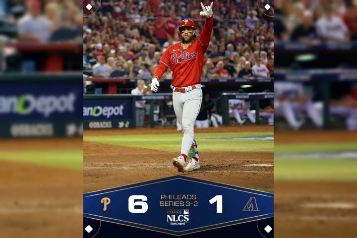 Zack Wheeler aportó otra joya de pitcheo en postemporada, con siete innings en blanco, mientras que Bryce Harper, Kyle Schwarber y J.T. Realmulto pegaron sendos jonrones para que los Filis de Filadelfia doblegaran el sábado 6-1 a los Diamondbacks de Arizona y tomaran una ventaja de 3-2 en la Serie de Campeonato de la Liga Nacional.
