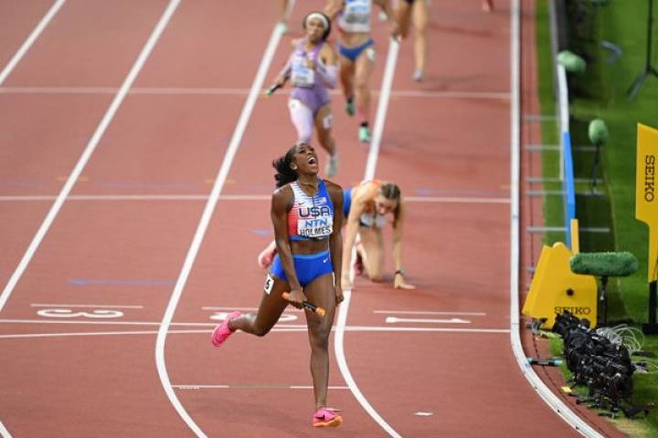 NOTICIAS 20/08/2023USA rompe récord mundial en 4x400Estados Unidos ganó el título mundial mixto de 4x400 m aquí esta noche en el Campeonato Mundial de Atletismo de Budapest 23 , mejorando su propio récord mundial a 3:08.80 después de que la poseedora del récord mundial de 400 m bajo techo de Holanda, Femke Bol, golpeara la cubierta a tres pasos de su casa mientras aparecía en al borde de anclar a su equipo a la victoria.