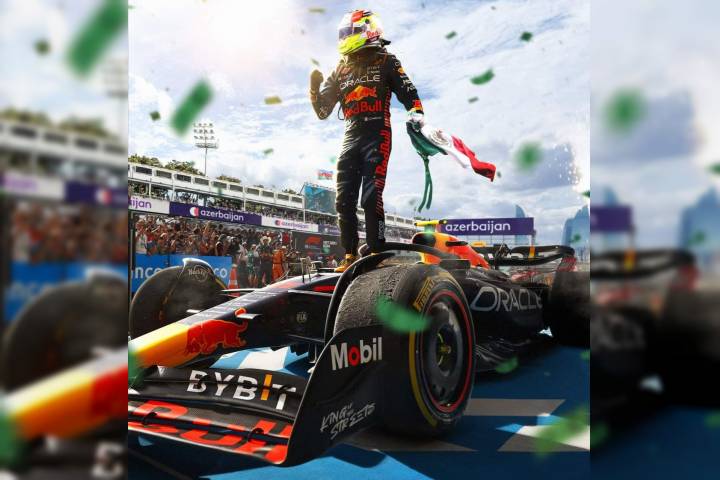 NOTICIAS 30/04/2023Gana Checo Pérez GP Azerbaiyàn F1Sergio Pérez se duplicó en las calles de Bakú al agregar a su triunfo en la carrera Sprint una victoria en el Gran Premio de Azerbaiyán lleno de drama del domingo, liderando a su compañero de equipo Red Bull Max Verstappen y a Charles Leclerc de Ferrari a casa para impulsar su carrera por el título.