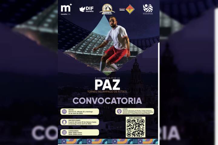 NOTICIAS 12/04/2023 Continúan abiertas las inscripciones al Torneo "A la Cancha por la Paz"El Gobierno de Morelia que encabeza el presidente Alfonso Martínez Alcázar, continúa haciendo alianzas para contribuir a la reconstrucción del tejido social mediante la práctica del deporte, por lo que en coordinación con la Arquidiócesis de Morelia, se prepara al Torneo "A la Cancha por la Paz.