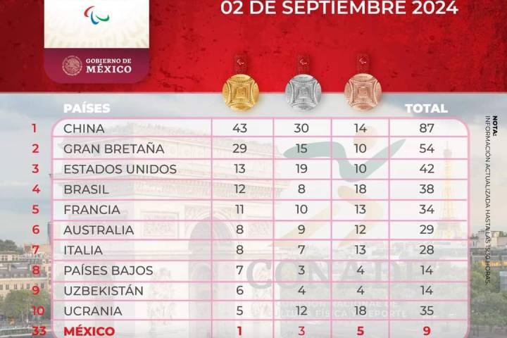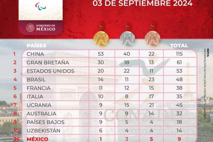 México cayó a la posición 36 de la clasificación general del medallero en los Juegos Paralímpicos París 2024, al no lograr sumar preseas en la jornada de hoy martes. La República Popular de China continua liderando la competencia con 53 metales de oro, seguido por Gran Bretaña y los Estados Unidos.