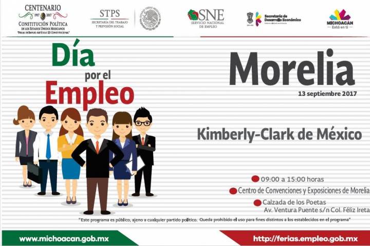 NOTICIAS 08/09/2017Oferta SNE Michoacán 122 vacantes de la empresa Kimberly Clark Como parte del acompañamiento que se da a las empresas que invierten en Michoacán para la contratación de perfiles laborales calificados, la Secretaría de Desarrollo Económico a través del Servicio Nacional de Empleo (SNE) Michoacán realizará la jornada "Día por el Empleo con Kimberly Clark" para promover 122 vacantes.