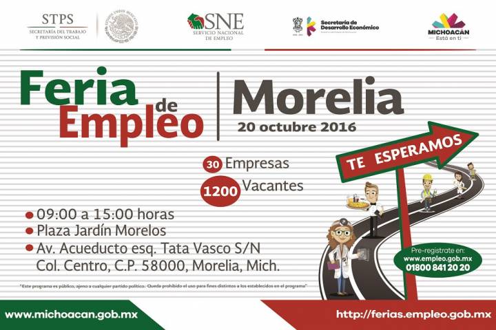 NOTICIAS 17/10/2016Ofertarán más de mil vacantes en Feria del Empleo en Morelia El próximo jueves 20 de octubre, cientos de michoacanos podrán obtener un empleo de las 1200 vacantes que 30 empresas ofertarán de las 9 a las 15 horas durante la Feria de Empleo, en la cual, los sueldos varÃan dependiendo del grado de escolaridad y aptitudes, señaló el titular de la SecretarÃa de Desarrollo Económico, Antonio Soto Sánchez.