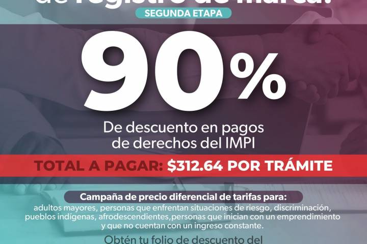 NOTICIAS 17/07/2023Este martes, vence el plazo de registro de marca con 90% de descuento: Sedeco De acuerdo con la Secretaría de Desarrollo Económico (Sedeco), este martes 18 de julio es el último día para acceder al beneficio del 90 por ciento de descuento sobre la solicitud de registro de marca ante el Instituto Mexicano de la Propiedad Industrial (IMPI).
